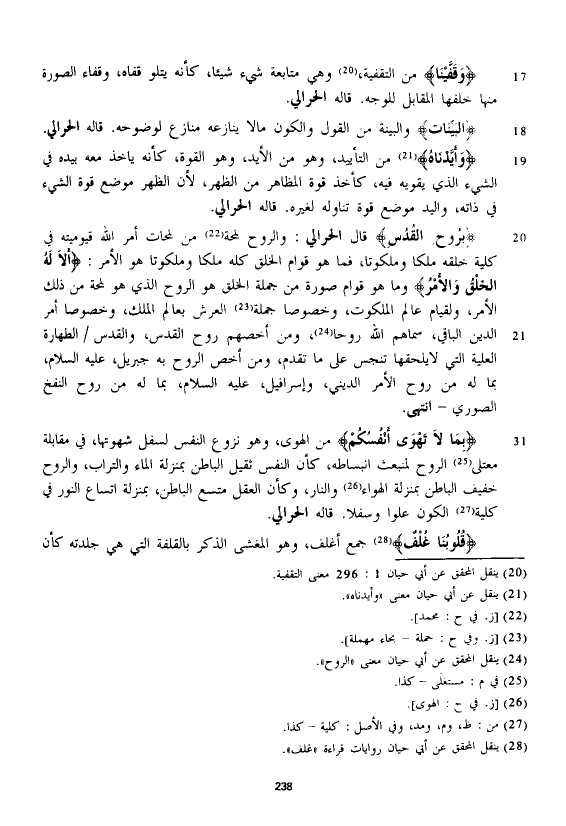 قال الْحَرَالِّي: والروح لمحة من لمحات أمر الله قيوميته في كلية خلقه ملكا وملكوتا، فما هو قوام الخلق كله ملكا وملكوتا هو الأمر. {أَلَا لَهُ الْخَلْقُ وَالْأَمْرُ} وما هو قوام صورة من جملة الخلق هو الروح الذي هو لمحة من ذلك الأمر، ولقيام عالم الملكوت، وخصوصا جملة العرش بعالم الملك، وخصوصا أمر الدين الباقي، سماهم الله روحا، ومن أخصهم روح القدس، والقدس الطهارة العلية التي لا يلحقها تنجس على ما تقدم، ومن أخص الروح به جبريل، عليه السلام، بما له من روح الأمر الديني، وإسرافيل، عليه السلام، بما له من روح النفخ الصوري - انتهى.