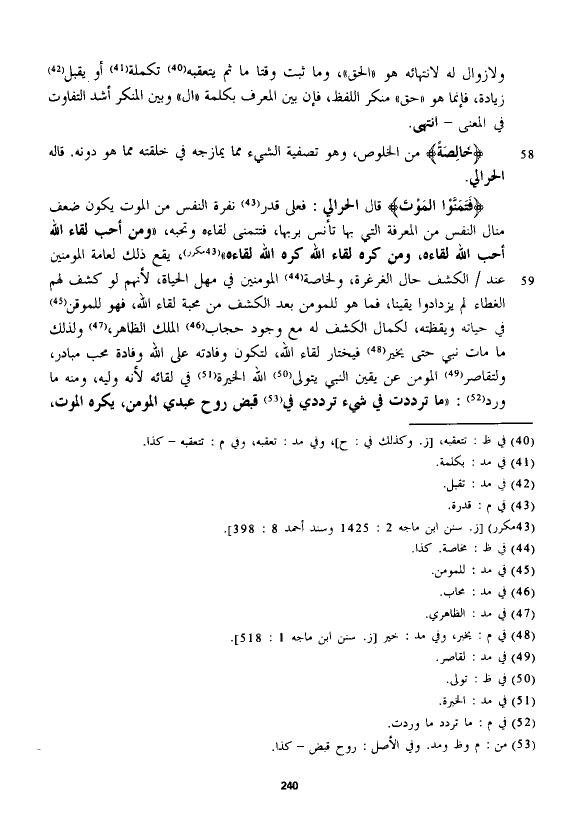 قال الْحَرَالِّي: فعلى قدر نقرة النفس من الموت يكون ضعف منال النفس من المعرفة التي بها تأنس بربها، فتتمنى لقاءه وتحبه، "ومن أحب لقاء الله أحب الله لقاءه، ومن كره لقاء الله كره الله لقاءها"، يقع ذلك لعامة المؤمنين عند الكشف حال الغرغرة، ولخاصة المؤمنين في مهل الحياة، لأنهم لو كشف لهم الغطاء لم يزدادوا يقينا، فما هو للمؤمن بعد الكشف من محبة لقاء الله، فهو للموقن في حياته ويقظته، لكمال الكشف له مع وجود حجاب الملك الظاهر، ولذلك ما مات نبي حتى يخير فيختار لقاء الله، لتكون وفادته على الله وفادة محب مبادر، ولتقاصر المؤمن عن يقين النبي يتولى الله الخيرة في لقائه لأنه وليه، ومنه ما ورد: "ما ترددت في شيء ترددي في قبض روح عبدي المؤمن، يكره الموت،