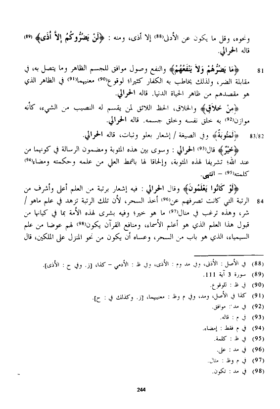 وقال الْحَرَالِّي: فيه إشعار برتبة من العلم أعلى وأشرف من الرتبة التي كانت تصرفهم عن أخذ السحر، لأن تلك الرتبة تزهد في علم ما هو شر، وهذه ترغب في منال ما هو خير؛ وفيه بشرى لهذه الأمة بما في كيانها من قبول هذا العلم الذي هو أعلم الأسماء، ومنافع القرآن يكون لهم عوضا من علم السيمياء، الذي هو باب من السحر، وعساه أن يكون من نحو المنزل على الملكين، قال