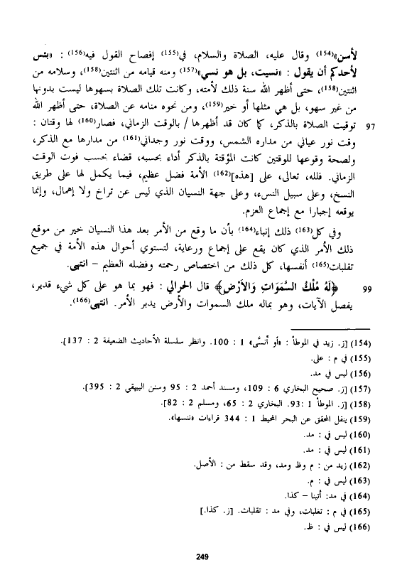 لأسن " وقال عليه الصلاة والسلام، في إفصاح القول فيه: "بئس لأحدكم أن يقول: "نسيت، بل هو نسي" ومنه قيامه من اثنتين، وسلامه من اثنتين، حتى أظهر الله سنة ذلك لأمته، وكانت تلك الصلاة بسهوها ليست بدونها من غير سهو، بل هي مثلها أو خير، ومن نحوه منامه عن الصلاة، حتى أظهر الله توقيت الصلاة بالذكر، كما كان قد أظهرها بالوقت الزماني، فصار لها وقتان: وقت نور عياني من مداره الشمس، ووقت نور وجداني من مدارها مع الذكر، ولصحة وقوعها للوقتين كانت المؤقتة بالذكر أداء بحسبه، قضاء بحسب فوت الوقت الزماني. فلله، تعالى، على [هذه] الأمة فضل عظيم، فيما يكمل لها على طريق النسخ، وعلى سبيل النسء، وعلى جهة النسيان الذي ليس عن تراخ ولا إهمال، وإنما يوقعه إجبارا مع إجماع العزم.