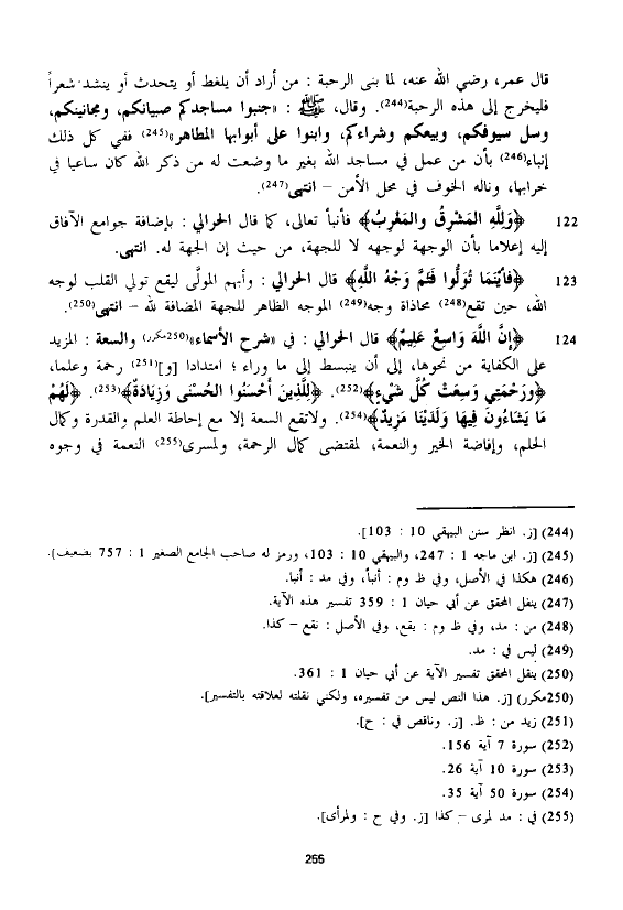 قال عمر، رضي الله عنه، لما بنى الرحبة: من أراد أن يلغط أو يتحدث أو ينشد شعرا فليخرج إلى هذه الرحبة. وقال، - صلى الله عليه وسلم -: "جنبوا مساجدكم صبيانكم، ومجانينكم، وسل سيوفكم، وبيعكم وشراءكم، وابنوا على أبوابها المطاهر" ففي كل ذلك إنباء بأن من عمل في مساجد الله بغير ما وضعت له من ذكر الله كان ساعيا في خرابها، وناله الخوف في محل الأمن انتهى.