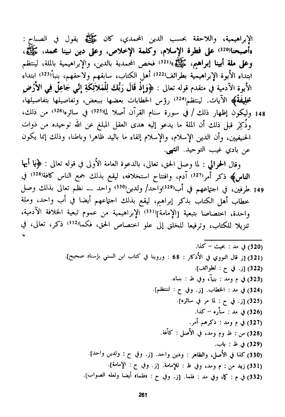 الإبراهيمية، واللاحقة بحسب الدين المحمدي، كان - صلى الله عليه وسلم - يقول في الصباح: "أصبحنا على فطرة الإسلام، وكلمة الإخلاص، وعلى دين نبينا محمد، - صلى الله عليه وسلم -، وعلى ملة أبينا إبراهيم، - صلى الله عليه وسلم - " فخص المحمدية بالدين، والإبراهيمية بالملة، لينتظم ابتداء الأبوة الإبراهيمية بطرائف أهل الكتاب، سابقهم ولاحقهم، بنبأ ابتداء الأبوة الآدمية في متقدم قوله تعالى: {وَإِذْ قَالَ رَبُّكَ لِلْمَلَائِكَةِ إِنِّي جَاعِلٌ فِي الْأَرْضِ خَلِيفَةً} الآيات. لينتظم رؤس الخطابات بعضها بببعض، وتفاصيلها بتفاصيلها، وليكون إظهار ذلك في سورة سنام القرآن أصلا لما في سائره من ذلك، وذكر قبل ذلك أن الملة ما يدعو إليه هدى العقل المبلغ عن الله توحيده من ذوات الحنيفيين، وأن الدين الإسلام، والإسلام إلقاء ما باليد ظاهراً وباطنا، وذلك إنما يكون عن بادي غيب التوحيد. انتهى.
