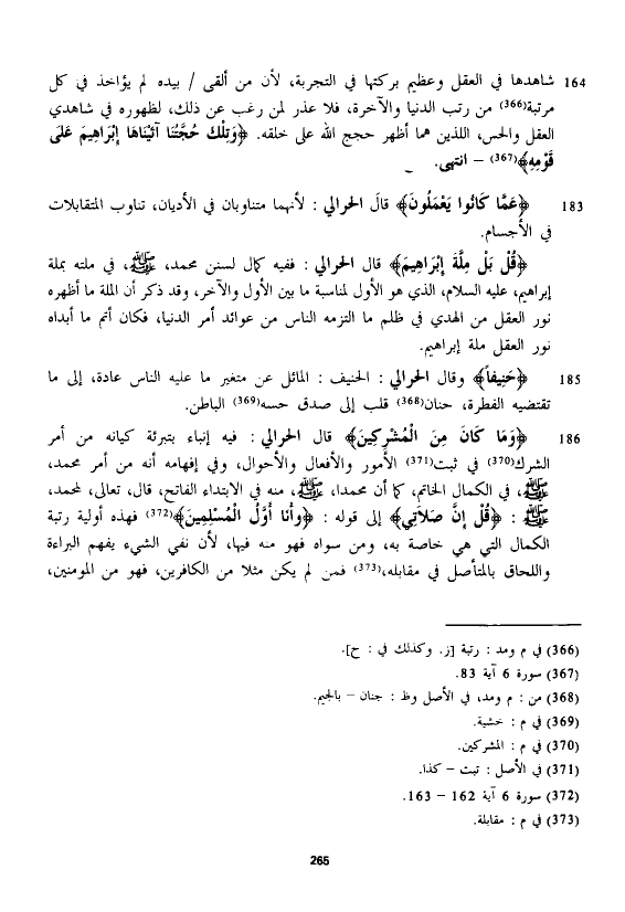 قال الْحَرَالِّي: ففيه كمال لسنن محمد، - صلى الله عليه وسلم -، في ملته بملة إبراهيم، عليه السلام، الذي هو الأول لمناسبة ما بين الأول والآخر، وقد ذكر أن الله ما أظهره نور العقل من الهدي في ظلم ما التزمه الناس من عوائد أمر الدنيا، فكان أتم ما أبداه نور العقل ملة إبراهيم.