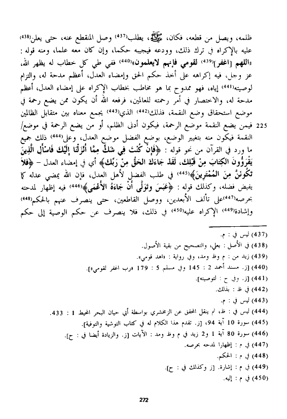ظلمه، ويصل من قطعه، فكان، - صلى الله عليه وسلم -، يطلب وصل المنقطع عنه، حتى يعلن عليه بالإكراه في ترك ذلك، وودعه فيجيبه حكما، وإن كان معه علما، ومنه قوله: "اللهم [اغفر] لقومي فإنهم لا يعلمون" ففي طي كل خطاب له يظهر الله، عز وجل، فيه إكراهه على أخذ حكم الحق وإمضاء العدل، أعظم مدحة له، والتزام لوصيته إياه، فهو ممدوح بما هو مخاطب بخطاب الإكراه على إمضاء العدل، أعظم مدحة له، والاختصار في أمر رحمته للعالمين، فرفعه الله أن يكون ممن يضع رحمة في موضع استحقاق وضع النقمة، فذلك الذى يجمع معناه بين متقابل الظالمين فيمن يضع النقمة موضع الرحمة، فيكون أدنى الظلم، أو من يضع الرحمة في موضع النقمة فيكون منه بتغيير الوضع، بوضع الفضل موضع العدل، وعلى ذلك جميع ما ورد في القرآن من نحو قوله: {فَإِنْ كُنْتَ فِي شَكٍّ مِمَّا أَنْزَلْنَا إِلَيْكَ فَاسْأَلِ الَّذِينَ يَقْرَءُونَ الْكِتَابَ مِنْ قَبْلِكَ لَقَدْ جَاءَكَ الْحَقُّ مِنْ رَبِّكَ} أي في إمضاء العدل - {فَلَا تَكُونَنَّ مِنَ الْمُمْتَرِينَ} في طلب الفضل لأهل العدل، فإن الله يمضي عدله كما يفيض فضله، وكذلك قوله: {عَبَسَ وَتَوَلَّى (1) أَنْ جَاءَهُ الْأَعْمَى} فيه إظهار لمدحته بحرصه على تألف الأبعدين، ووصل القاطعين، حتى ينصرف عنهم بالحكم وإشادة الإكراه عليه في ذلك، فلا ينصرف عن حكم الوصية إلى حكم