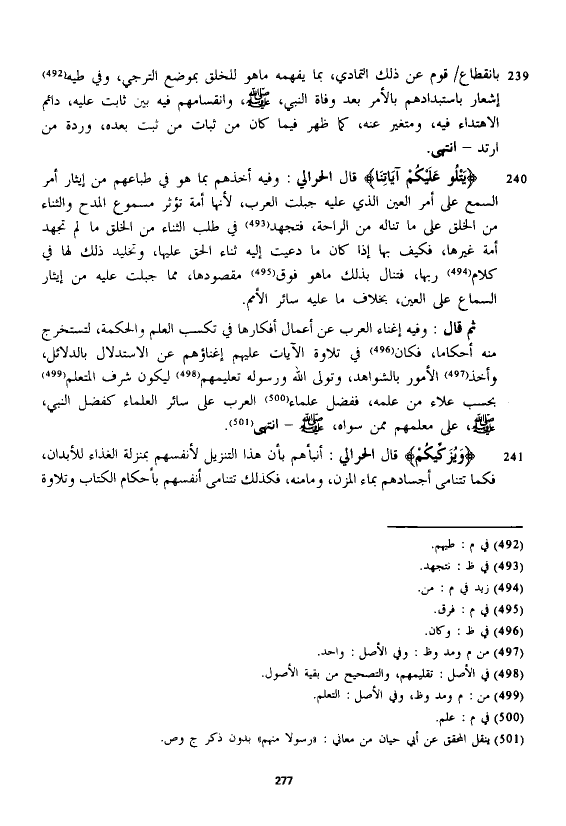 ثم قال: وفيه إغناء العرب عن أعمال أفكارها في تكسب العلم والحكمة، لتستخرج منه أحكاما، فكان في تلاوة الآيات عليهم إغناؤهم عن الاستدلال بالدلائل، وأخذ الأمور بالشواهد، وتولى الله ورسوله تعليمهم ليكون شرف المتعلم بحسب علاء من علمه، ففضل علماء العرب على سائر العلماء كفضل النبي، - صلى الله عليه وسلم -، على معلمهم ممن سواه، - صلى الله عليه وسلم - انتهى.