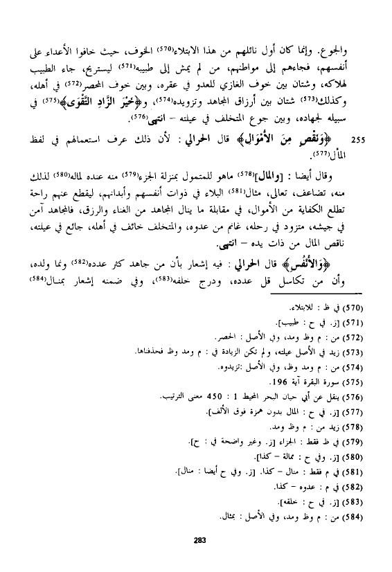 وقال أيضا: [والمال] ماهو للمتمول بمنزلة الجزء منه عنده لماله لذلك منه، تضاعف، تعالى، مثال البلاء في ذوات أنفسهم وأبدانهم، ليقطع عنهم راحة تطلع الكفاية من الأموال، في مقابلة ما ينال المجاهد من الغناء والرزق، فالمجاهد آمن في جيشه، متزود في رحله، غانم من عدوه، والمتخلف خائف في أهله، جائع في عيلته، ناقص المال من ذات يده - انتهى.
