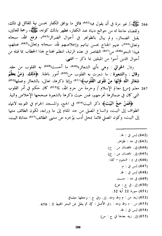 وقال الْحَرَالِّي: وهي "أي الشعائر" ما أحست به القلوب من حقه. وقال: والشعيرة: ما شعرت به القلوب من أمور باطنة. {ذَلِكَ وَمَنْ يُعَظِّمْ شَعَائِرَ اللَّهِ فَإِنَّهَا مِنْ تَقْوَى الْقُلُوبِ} وإنما ذكرها، تعالى، بالشعائر وعملها معلم [من] معالم الإسلام وحرمة من حرم الله، لما كان حكم في أمر القلوب التي كان في ضمائرها تحرجهم، فمن حيث ذكرها بالشعيرة صححها الإخلاص والنية.
