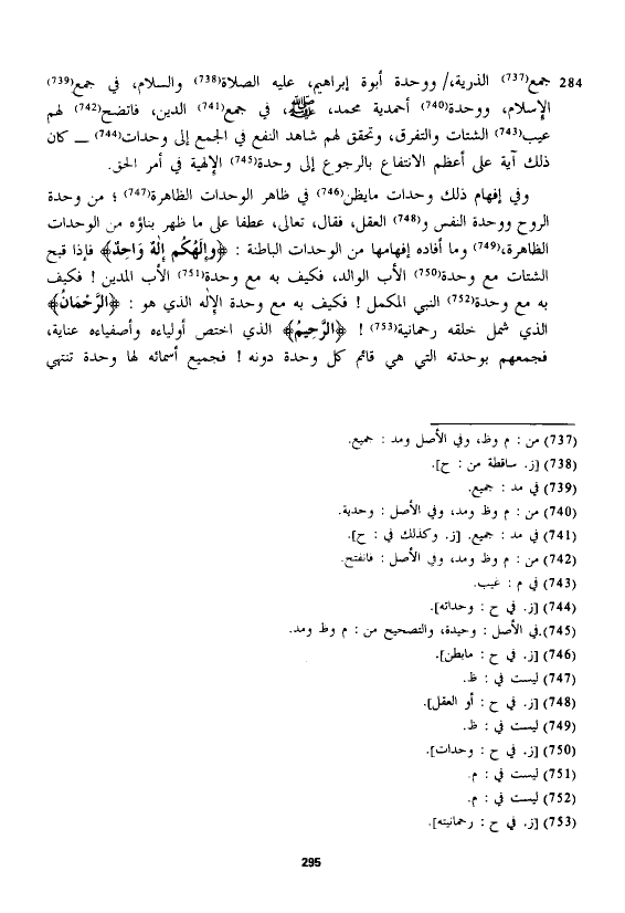 وفي إفهام ذلك وحدات مايظن في ظاهر الوحدات الظاهرة؛ من وحدة الروح ووحدة النفس والعقل، فقال، تعالى، عطفا على ما ظهر بناؤه من الوحدات الظاهرة، وما أفاده إفهامها من الوحدات الباطنة: {وَإِلَهُكُمْ إِلَهٌ وَاحِدٌ} فإذا قبح الشتات مع وحدة الأب الوالد، فكيف به مع وحدة الأب المدين! فكيف به مع وحدة النبي المكمل! فكيف به مع وحدة الإله الذي هو: {الرَّحْمَنِ} الذي شمل خلقه رحمانية! {الرَّحِيمِ} الذي اختص أولياءه وأصفياءه عناية، فجمعهم بوحدته التي هي قائم كل وحدة دونه! فجميع أسمائه لها وحدة تنتهي