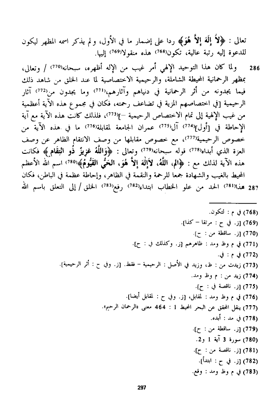 ولما كان هذا التوحيد الإلهي أمر غيب من الإله أظهره، سبحانه وتعالى، بمظهر الرحمانية المحيطة الشاملة، والرحيمية، الاختصاصية لما عند الخلق من شاهد ذلك فيما يجدونه من أثر الرحمانية في دنياهم وأثارهم، وما يجدون من آثار الرحيمية [في اختصاصهم المزية في تضاعف رحمته، فكان في مجموع هذه الآية أعظمية من غيب الإلهية إلى تمام الاختصاص الرحيمية -]، فلذلك كانت هذه الآية مع آية الإحاطة في [أول] آل عمران الجامعة لمقابلة ما في هذه الآية من خصوص الرحيمية، مع خصوص مقابلها من وصف الانتقام الظاهر عن وصف العزة الذي أبداه قوله سبحانه وتعالى: {وَاللَّهُ عَزِيزٌ ذُو انْتِقَامٍ} فكانت هذه الآية لذلك مع: {الم (1) اللَّهُ لَا إِلَهَ إِلَّا هُوَ الْحَيُّ الْقَيُّومُ} اسم الله الأعظم المحيط بالغيب والشهادة جمعا للرحمة والنقمة في الظاهر، وإحاطة عظمة في الباطن، فكان هذا الحد من علو الخطاب ابتداء رفع الخلق إلى التعلق باسم الله