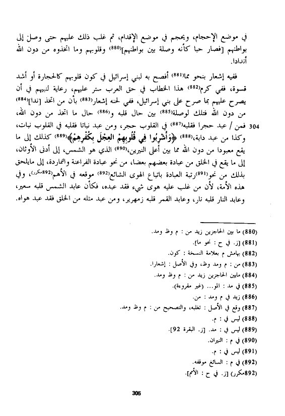 ففيه إشعار بنحو مما أفصح به لبني إسرائيل في كون قلوبهم كالحجارة أو أشد قسوة، ففي كرم هذا الخطاب في حق العرب ستر عليهم، رعاية لنبيهم في أن يصرح عليهم بما صرح على بني إسرائيل، ففي لحنه إشعار بأن من اتخذ [ندا] من دون الله فتلك لوصلة بين حال قلبه وحال ما اتخذ من دون الله، فمن عبد حجرا فقلبه في القلوب حجر، ومن عبد نباتا فقلبه في القلوب نبات، وكذا من عبد دابة، {وَأُشْرِبُوا فِي قُلُوبِهِمُ الْعِجْلَ بِكُفْرِهِمْ} كذلك إلى ما يقع معبودا من دون الله مما بين أعلى النيرين، الذي هو الشمس، إلى أدنى الأوثان، إلى ما يقع في الخلق من عبادة بعضهم بعضا، من نحو عبادة الفراعنة والنماردة، إلى ما يلحق بذلك من نحو رتبة العبادة باتباع الهوى الشائع موقعه في الأهم، وفي هذه الأمة، لأن من غلب عليه هوى شيء فقد عبده، فكأن عابد الشمس قلبه سعير، وعابد النار قلبه نار، وعابد القمر قلبه زمهرير، ومن عبد مثله من الخلق فقد عبد هواه.