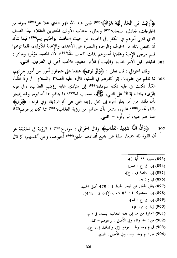 {أَرَأَيْتَ مَنِ اتَّخَذَ إِلَهَهُ هَوَاهُ} فمن عبد الله فهو الذي علا عن سواه من المخلوقات، فعادل، سبحانه وتعالى، خطاب الأولين المعتبرين العقلاء بهذا الصنف الذي انتهى أمرهم في الكفر إلى الحب، من حيث اعتلقت بواطنهم بهم فيما شأنه أن يختص بالله من الخوف والرجاء والنصرة على الأعداء، والإعانة للأولياء، فلما توهموا فيهم مرجى الإلهية ومخافتها أحبوهم لذلك كحب الله، لأن المتعبد مؤتمر، ومبادر: فالمبادر قبل الأمر محب، والمجيب للأمر مطيع، فالمحب أعلى في الطرفين. انتهى.