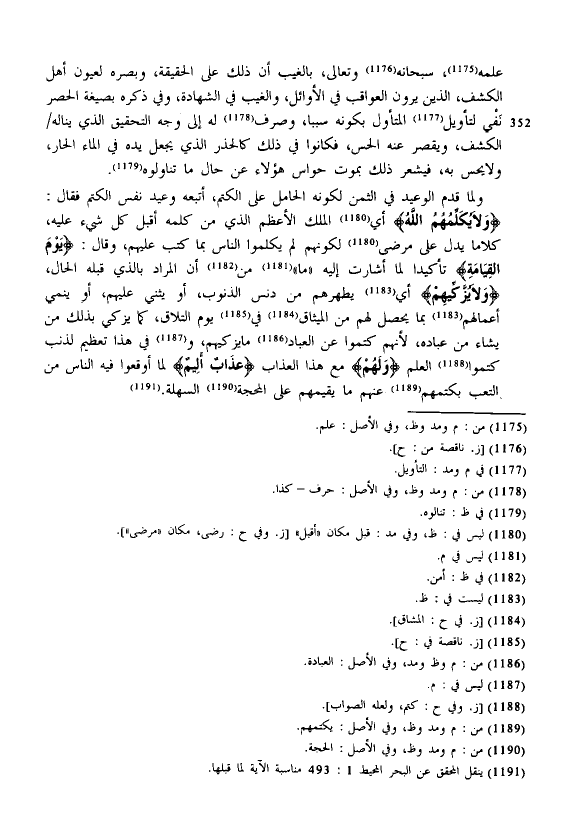 ولما قدم الوعيد في الثمن لكونه الحامل على الكتم، أتبعه وعيد نفس الكتم فقال: {وَلَا يُكَلِّمُهُمُ اللَّهُ} أي الملك الأعظم الذي من كلمه أقبل كل شيء عليه، كلاما يدل على مرضى لكونهم لم يكلموا الناس بما كتب عليهم، وقال: {يَوْمَ الْقِيَامَةِ} تأكيدا لما أشارت إليه "ما" من أن المراد بالذي قبله الحال، {وَلَا يُزَكِّيهِمْ} أي يطهرهم من دنس الذنوب، أو يثني عليهم، أو ينمي أعمالهم بما يحصل لهم من الميثاق في يوم التلاق، كما يزكي بذلك من يشاء من عباده، لأنهم كتموا عن العباد ما يزكيهم، وفي هذا تعظيم لذنب كتموا العلم {وَلَهُمْ} مع هذا العذاب {عَذَابٌ أَلِيمٌ} لما أوقعوا فيه الناس من التعب بكتمهم عنهم ما يقيمهم على المحجة السهلة.