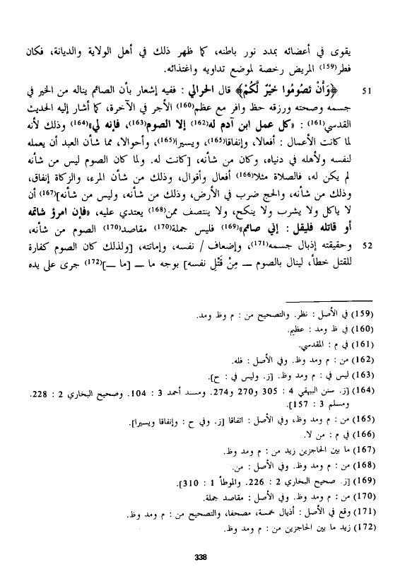 قال الْحَرَالِّي: ففيه إشعار بأن الصائم يناله من الخير في جسمه وصحته ورزقه حظ وافر مع عظم الأجر في الآخرة، كما أشار إليه الحديث القدسي: "كل عمل ابن آدم له إلا الصوم، فإنه لي" وذلك لأنه لما كانت الأعمال: أفعالا، وإنفاقا، ويسيرا، وأحوالا، مما شأن العبد أن يعمله لنفسه ولأهله في دنياه، وكان من شأنه، [كانت له. ولما كان الصوم ليس من شأنه لم يكن له، فالصلاة مثلا أفعال وأقوال، وذلك من شأن المرء، والزكاة إنفاق، وذلك من شأنه، والحج ضرب في الأرض، وذلك من شأنه، وليس من شأنه] أن لا يأكل ولا يشرب ولا ينكح، ولا ينتصف ممن يعتدي عليه، "فإن امرؤ شاتمه أو قاتله فليقل: إني صائم" فليس جملة مقاصد الصوم من شأنه، وحقيقته إذبال جسمه، وإضعاف نفسه، وإماتته، [ولذلك كان الصوم كفارة للقتل خطأ، لينال بالصوم - من قتل نفسه] بوجه ما -[ما -] جرى على يده