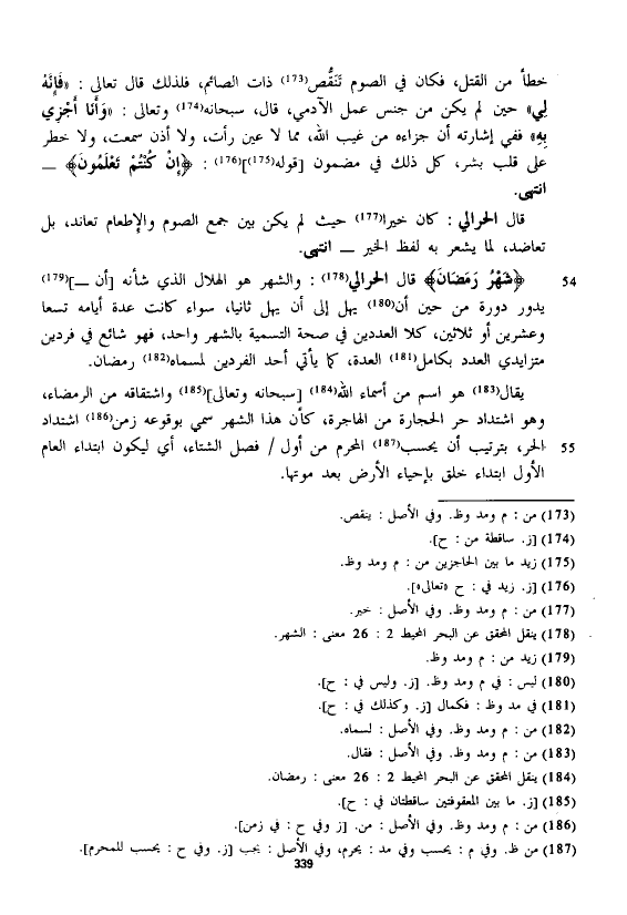 {شَهْرُ رَمَضَانَ} قال الحرالى: والشهر هو الهلال الذي شأنه [أن -] يدور دورة من حين أن يهل إلى أن يهل ثانيا، سواء كانت عده أيامه تسعا وعشرين أو ثلاثين، كلا العددين في صحة التسمية بالشهر واحد، فهو شائع في فردين متزايدي العدد بكامل العدة، كما يأتي أحد الفردين لمسماه رمضان.