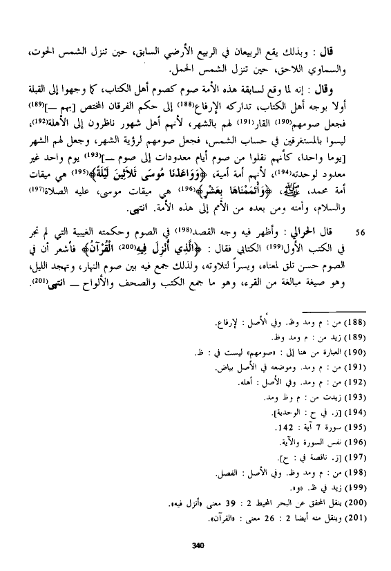 وقال: إنه لما وقع لسابقة هذه الأمة صوم كصوم أهل الكتاب، كما وجهوا إلى القبلة أولا بوجه أهل الكتاب، تداركه الإرفاع إلى حكم الفرقان المختص [بهم -] فجعل صومهم القار لهم بالشهر، لأنهم أهل شهور ناظرون إلى الأهلة، ليسوا بالمستغرقين في حساب الشمس، فجعل صومهم لرؤية الشهر، وجعل لهم الشهر [يوما واحداً، كأنهم نقلوا من صوم أيام معدودات إلى صوم -] يوم واحد غير معدود لوحدته، لأنهم أمة أمية، {وَوَاعَدْنَا مُوسَى ثَلَاثِينَ لَيْلَةً} هي ميقات أمه محمد، - صلى الله عليه وسلم -، {وَأَتْمَمْنَاهَا بِعَشْرٍ} هي ميقات موسى، عليه الصلاة والسلام، وأمته ومن بعده من الأمم إلى هذه الأمة. انتهى.