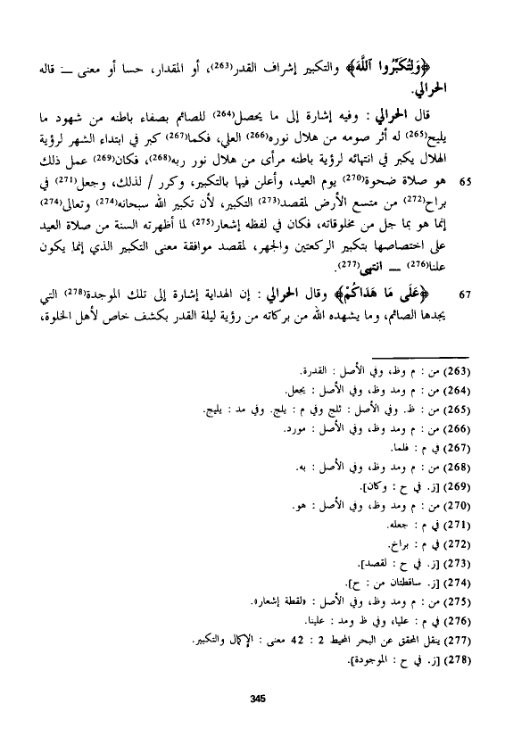 قال الْحَرَالِّي: وفيه إشارة إلى ما يحصل للصائم بصفاء باطنه من شهود ما يليح له أثر صومه من هلال نوره العلي، فكما كبر في ابتداء الشهر لرؤية الهلال يكبر في انتهائه لرؤية باطنه مرأى من هلال نور ربه، فكان عمل ذلك هو صلاة ضحوة يوم العيد، وأعلن فيها بالتكبير، وكرر لذلك، وجعل في براح من متسع الأرض لمقصد التكبير، لأن تكبير الله سبحانه وتعالى إنما هو بما جل من مخلوقاته، فكان في لفظه إشعار لما أظهرته السنة من صلاة العيد على اختصاصها بتكبير الركعتين والجهر، لمقصد موافقة معنى التكبير الذي إنما يكون علنا - انتهى.