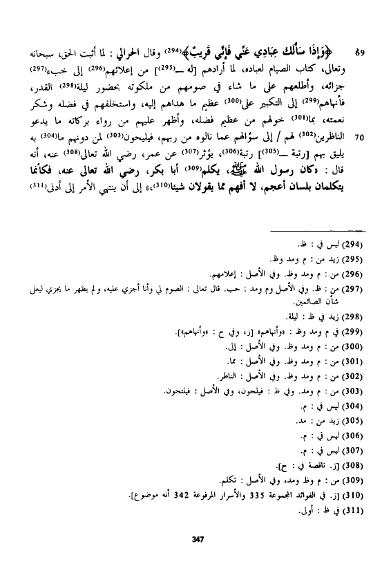 وقال الْحَرَالِّي: لما أثبت الحق، سبحانه وتعالى، كتاب الصيام لعباده، لما أرادهم [له -] من إعلائهم إلى خبء جزائه، وأطلعهم على ما شاء في صومهم من ملكوته بحضور ليلة القدر، فأنهاهم إلى التكبير على عظيم ما هداهم إليه، واستخلفهم في فضله وشكر نعمته، بما خولهم من عظيم فضله، وأظهر عليهم من رواء بركاته ما يدعو الناظرين لهم إلى سؤالهم عما نالوه من ربهم، فيليحون لمن دونهم ما به يليق بهم [رتبة -] رتبة، يؤثر عن عمر، رضي الله تعالى عنه، أنه قال: "كان رسول الله - صلى الله عليه وسلم -، يكلم أبا بكر، رضي الله تعالى عنه، فكأنما يتكلمان بلسان أعجم، لا أفهم مما يقولان شيئا" إلى أن ينتهي الأمر إلى أدنى