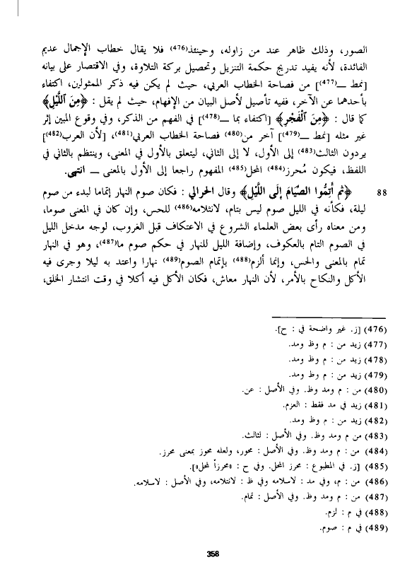 الصور، وذلك ظاهر عند من زاوله، وحينئذ فلا يقال خطاب الإجمال عديم الفائدة، لأنه يفيد تدريج حكمة التنزيل وتحصيل بركة التلاوة، وفي الاقتصار على بيانه [نمط -] من فصاحة الخطاب العربي، حيث لم يكن فيه ذكر الممثولين، اكتفاء بأحدهما عن الآخر، ففيه تأصيل لأصل البيان من الإفهام، حيث لم يقل: {مِنَ اللَّيْلِ} كما قال: {مِنَ الْفَجْرِ} [اكتفاء بما -] في الفهم من الذكر، وفي وقوع المبين إثر غير مثله [نمط -] آخر من فصاحة الخطاب العربي، [لأن العرب] يردون الثالث إلى الأول، لا إلى الثاني، ليتعلق بالأول في المعنى، وينتظم بالثاني في اللفظ، فيكون محرز المحل المفهوم راجعا إلى الأول بالمعنى - انتهى.