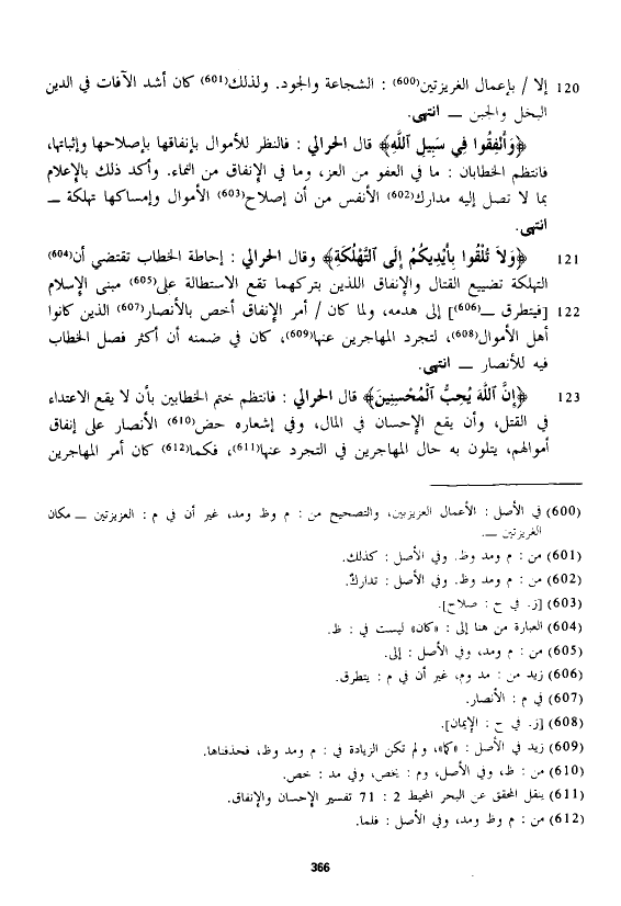 قال الْحَرَالِّي: فانتظم ختم الخطابين بأن لا يقع الاعتداء في القتل، وأن يقع الإحسان في المال، وفي إشعاره حض الأنصار على إنفاق أموالهم، يتلون به حال الهاجرين في التجرد عنها، فكما كان أمر المهاجرين