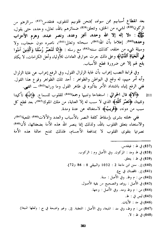 بعد انقطاع أسبابهم في سواه، ليمتحن قلوبهم للتقوى، فتتقدس سرائرهم من الركون لشيء من الخلق، وتتعلق ضمائرهم بالله، تعالى، وحده، حتى يقول، - صلى الله عليه وسلم -: "لا إله إلا الله وحده، أنجز وعده، ونصر عبده، وهزم الأحزاب وحده". إعلاما بأن الله، سبحانه وتعالى، ناصره دون حجاب، ولا وسيلة شيء من خلقه، كذلك سنته مع رسله: {إِنَّا لَنَنْصُرُ رُسُلَنَا وَالَّذِينَ آمَنُوا فِي الْحَيَاةِ الدُّنْيَا} وعلى ذلك جرت خوارق العادات للأولياء وأهل الكرامات، لا يكاد يقع لهم إلا عن ضرورة قطع الأسباب.