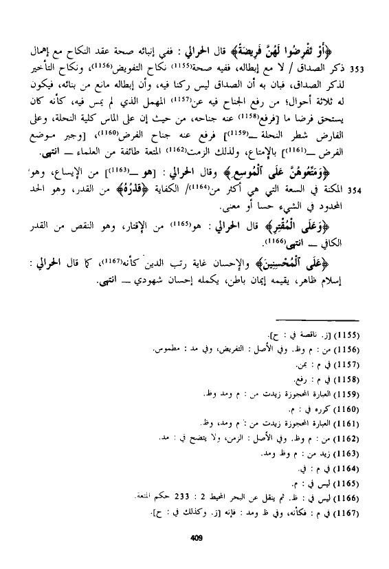 قال الْحَرَالِّي: ففي إنبائه صحة عقد النكاح مع إهمال ذكر الصداق لا مع إبطاله، ففيه صحة نكاح التفويض، ونكاح التأخير لذكر الصداق، فبان به أن الصداق ليس ركنا فيه، وأن إبطاله مانع من بنائه، فيكون له ثلاثة أحوال؛ من رفع الجناح فيه عن المهمل الذي لم يمس فيه، كأنه كان يستحق فرضا ما [فرفع عنه جناحه، من حيث إن على الماس كلية النحلة، وعلى الفارض شطر النحلة -] فرفع عنه جناح الفرض، [وجبر موضع الفرض -] بالإمتاع، ولذلك ألزمت المتعة طائفة من العلماء - انتهى.