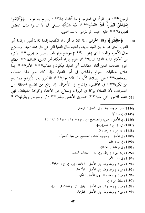 وقال الْحَرَالِّي: لما كان ما أنزل له الكتاب إقامة ثلاثة أمور: إقامة أمر الدين، الذي هو ما بين العبد وربه، وتمشية حال الدنيا التي هي دار محنة العبد، وإصلاح حال الآخرة والمعاد الذي [هو -] موضع قرار العبد. صار ما يجري ذكره من أحكام تمشية الدنيا غلسا، نجوم إنارته أحكام أمر الدين، فلذلك مطلع نجوم خطابات الدين أثناء خطابات أمر الدنيا، فيكون [خطاب] الأمر نجما خلال خطابات الحرام والحلال في أمر الدنيا، وإنما كان نجم هذا الخطاب للمحافظة على الصلاة، لأن هذا الاشتجار المذكور بين الأزواج فيما يقع من تكره في الأنفس، وتشاح في الأحوال، إنما وقع من تضييع المحافظة على الصلوات، لأن الصلاة بركة في الرزق، وسلاح على الأعداء وكراهة الشيطان، فهي دافعة للأمور التي منها تتضايق الأنفس وتقبل الوسواس ويطرقها