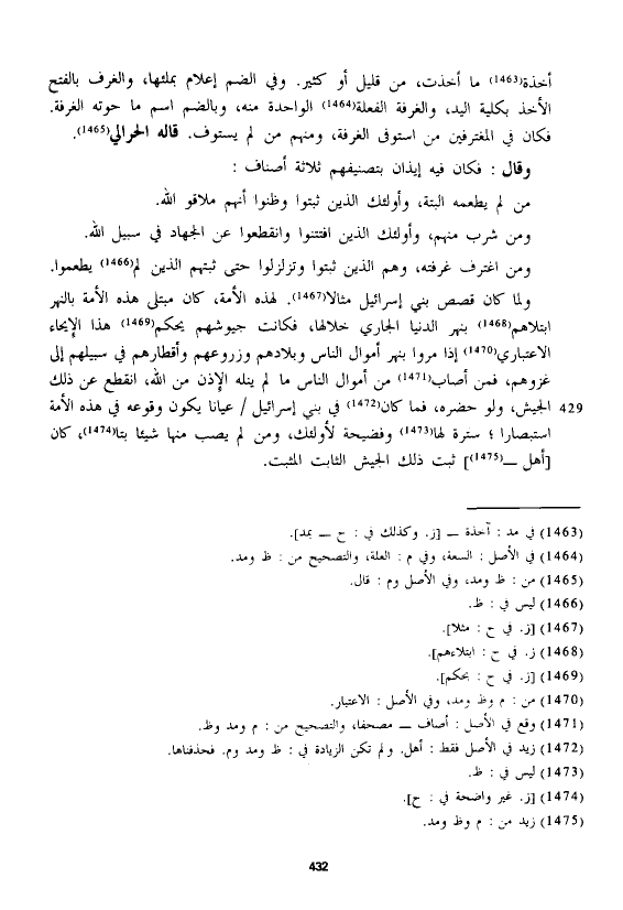 ولما كان قصص بني إسرائيل مثالا. لهذه الأمة، كان مبتلى هذه الأمة بالنهر ابتلاهم بنهر الدنيا الجاري خلالها، فكانت جيوشهم يحكم هذا الإيحاء الاعتباري إذا مروا بنهر أموال الناس وبلادهم وزروعهم وأقطارهم في سبيلهم إلى غزوهم، فمن أصاب من أموال الناس ما لم ينله الإذن من الله، انقطع عن ذلك الجيش، ولو حضره، فما كان في بني إسرائيل عيانا يكون وقوعه في هذه الأمة استبصارا؛ سترة لها وفضيحة لأولئك، ومن لم يصب منها شيئا بتا، كان [أهل -] ثبت ذلك الجيشا الثابت المثبت.