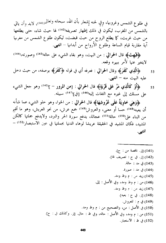 في طلوع الشمس وغروبها، وفي لحنه إشعار بأن الله، سبحانه وتعالى، لابد وأن ياتي بالشمس من المغرب، ليكون في ذلك إظهار تصريفه لها حيث شاء، حتى يطلعها من حيث غربت، كما يطلع الروح من حيث قبضت، ليكون طلوع الشمس من مغربها آية مقاربة قيام الساعة وطلوع الأرواح من أبدانها - انتهى.