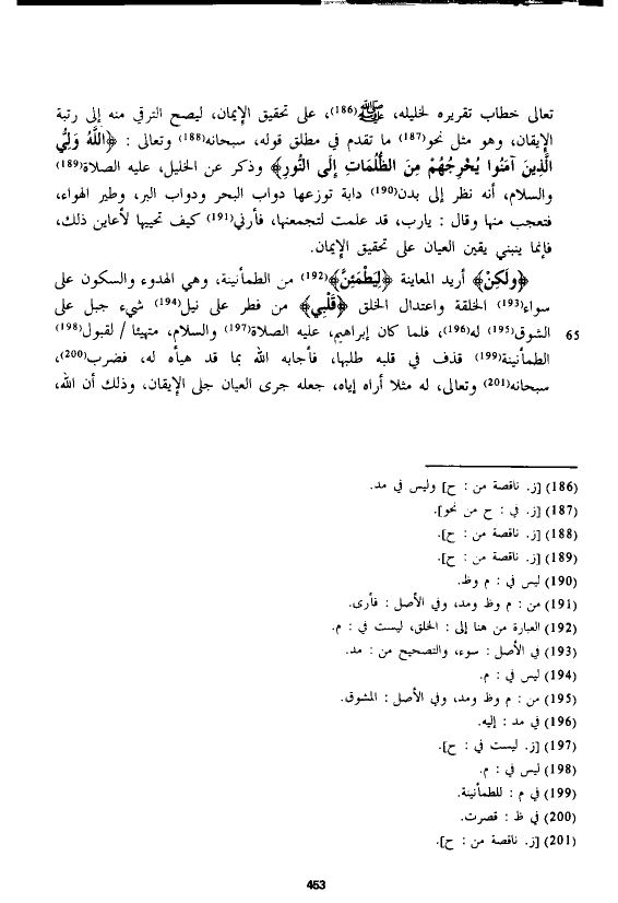 تعالى خطاب تقريره لخليله، - صلى الله عليه وسلم -، على تحقيق الإيمان، ليصح الترقي منه إلى رتبة الإيقان، وهو مثل نحو ما تقدم في مطلق قوله، سبحانه وتعالى: {اللَّهُ وَلِيُّ الَّذِينَ آمَنُوا يُخْرِجُهُمْ مِنَ الظُّلُمَاتِ إِلَى النُّورِ} وذكر عن الخليل، عليه الصلاة والسلام، أنه نظر إلى بدن دابة توزعها دواب البحر ودواب البر، وطير الهواء، فتعجب منها وقال: يارب، قد علمت لتجمعنها، فأرني كيف تحييها لأعاين ذلك، فإنما ينبني يقين العيان على تحقيق الإيمان.