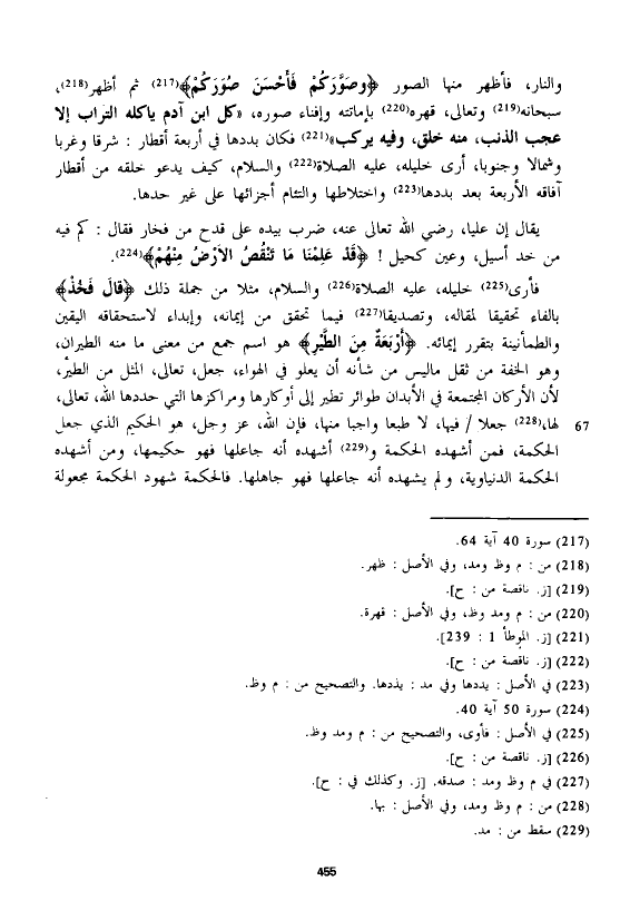 فأرى خليله، عليه الصلاة والسلام، مثلا من جملة ذلك {قَالَ فَخُذْ} بالفاء تحقيقا لمقاله، وتصديقا فيما تحقق من إيمانه، وإبداء لاستحقاقه اليقين والطمأنينة بتقرر إيمائه. {أَرْبَعَةً مِنَ الطَّيْرِ} هو اسم جمع من معنى ما منه الطيران، وهو الخفة من ثقل ماليس من شأنه أن يعلو في الهواء، جعل، تعالى، المثل من الطير، لأن الأركان المجتمعة في الأبدان طوائر تطير إلى أوكارها ومراكزها التي حددها الله، تعالى، لها، جعلا فيها، لا طبعا واجبا منها، فإن الله، عز وجل، هو الحكيم الذي جعل الحكمة، فمن أشهده الحكمة وأشهده أنه جاعلها فهو حكيمها، ومن أشهده الحكمة الدنياويه، ولم يشهده أنه جاعلها فهو جاهلها. فالحكمة شهود الحكمة مجعولة