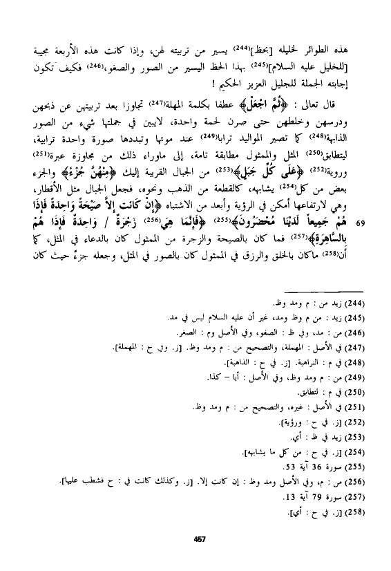 هذه الطوائر لحلوله لخليله، يسير من تربيته لهن، إذا كانت هده الأربعة مجيبة [للخليل عليه السلام] بهذا الحظ اليسير من الصور والصغو فكيف. تكون إجابته الجملة للجليل العزيز الحكيم!