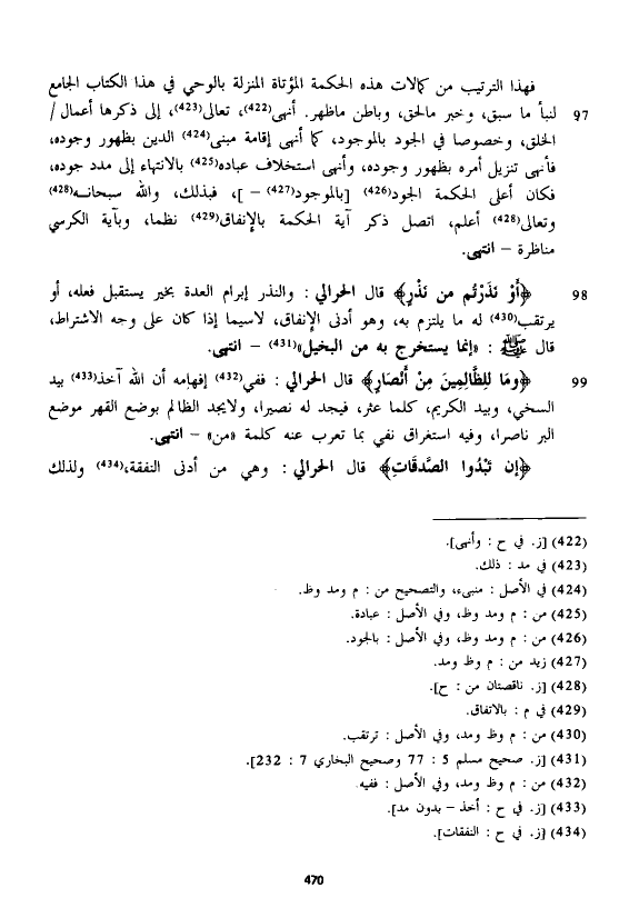 فهذا الترتيب من كمالات هذه الحكمة المؤتاة المنزلة بالوحي في هذا الكتاب الجامع لنبأ ما سبق، وخبر ما لحق، وباطن ما ظهر. انهى، تعالى، إلى ذكرها أعمال الخلق، وخصوصا في الجود بالموجود، كما أنهى إقامة مبنى الدين بظهور وجوده، فأنهى تنزيل أمره بظهور وجوده، وأنهى استخلاف عباده بالانتهاء إلى مدد جوده، فكان أعلى الحكمة الجود [بالموجود -]، فبذلك، والله سبحانه وتعالى أعلم، اتصل ذكر آية الحكمة بالإنفاق نظما، وبآية الكرسي مناظرة - انتهى.