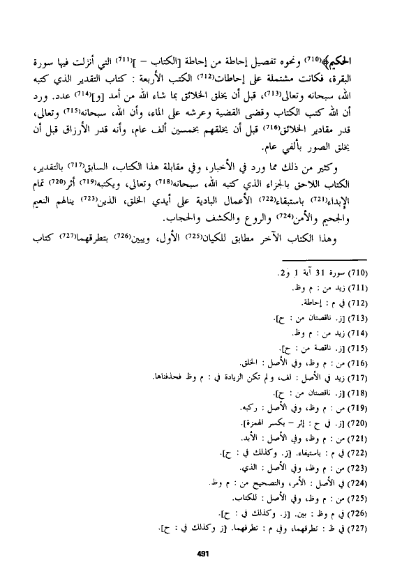 ونحوه تفصيل إحاطة من إحاطة [الكتاب -] التي أنزلت فيها سورة البقرة، فكانت مشتملة على إحاطات الكتب الأربعة: كتاب التقدير الذي كتبه الله، سبحانه وتعالي، قبل أن يخلق الخلائق بما شاء الله من أمد [و] عدد. ورد أن الله كتب الكتاب وقضى القضية وعرشه على الماء، وأن الله، سبحانه وتعالى، قدر مقادير الخلائق قبل أن يخلقهم بخمسين ألف عام، وأنه قدر الأرزاق قبل أن يخلق الصور بألفي عام.