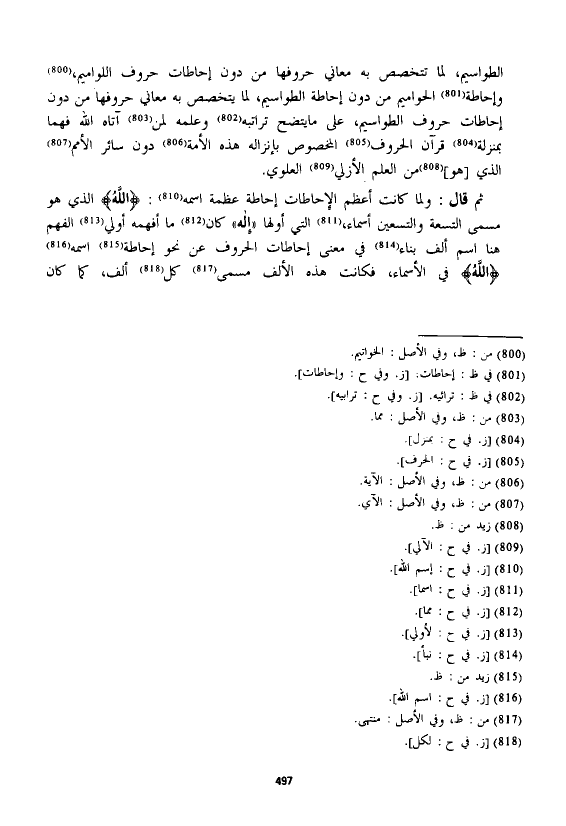 الطواسيم، لما تتخصص به معاني حروفها من دون إحاطات حروف اللواميم، وإحاطة الحواميم من دون إحاطة الطواسيم، لما يتخصص به معاني حروفها من دون إحاطات حروف الطواسيم، على ما يتضح تراتبه وعلمه لمن آتاه الله فهما بمنزلة قرآن الحروف المخصوص بإنزاله هذه الأمة دون سائر الأمم الذي [هو] من العلم الأزلي العلوي.