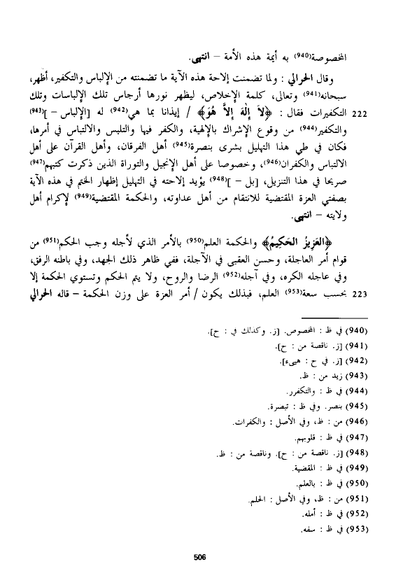 وقال الْحَرَالِّي: ولما تضمنت إلاحة هذه الآية ما تضمنته من الإلباس والتكفير، أظهر، سبحانه وتعالى، كلمة الإخلاص، ليظهر نورها أرجاس تلك الإلباسات وتلك التكفيرات فقال: {لَا إِلَهَ إِلَّا هُوَ} إيذانا بما هي له [الإلباس -] والتكفير من وقوع الإشراك بالإلهية، والكفر فيها والتلبس والالتباس في أمرها، فكان في هذا التهليل بشرى بنصرة أهل الفرقان، وأهل القرآن على أهل الالتباس والكفران، وخصوصا على أهل الإنجيل والتوراة الذين ذكرت كتبهم صريحا في هذا التنزيل، [بل -] يؤيد إلاحته في التهليل إظهار الختم في هذه الآية بصفتي العزة المقتضية للانتقام من أهل عداوته، والحكمة المقتضية لإكرام أهل ولايته - انتهى.