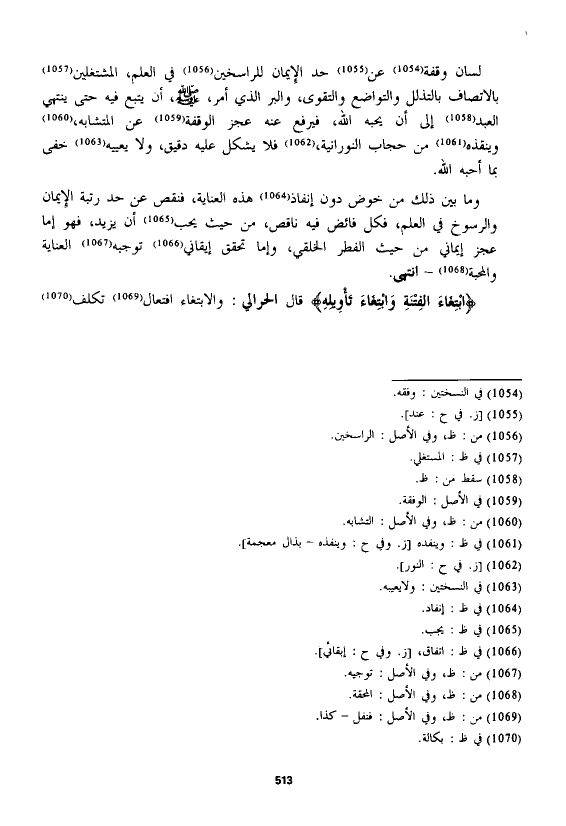 لسان وقفة عن حد الإيمان للراسخين في العلم، المشتغلين بالاتصاف بالتذلل والتواضع والتقوى، والبر الذي أمر، - صلى الله عليه وسلم -، أن يتبع فيه حتى ينتهي العبد إلى أن يحبه الله، فيرفع عنه عجز الوقفة عن المتشابه، وينقذه من حجاب النورانية، فلا يشكل عليه دقيق، ولا يعييه خفي بما أحبه الله.
