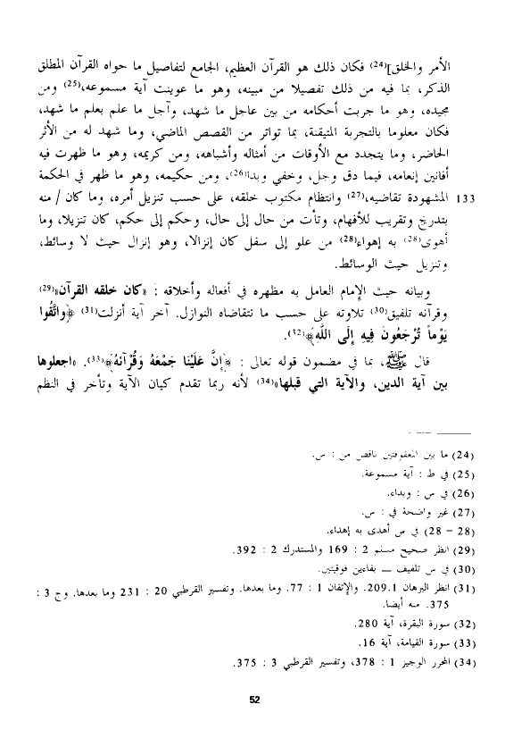 وبيانه حيث الإمام العامل به مظهره في أفعاله وأخلاقه: "كان خلقه القرآن" وقرآنه تلفيق تلاوته على حسب ما تتقاضاه النوازل. آخر آية أنزلت {وَاتَّقُوا يَوْمًا تُرْجَعُونَ فِيهِ إِلَى اللَّهِ}.
