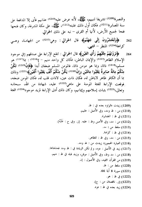 قال الْحَرَالِّي: لتقع الإرادة على صدقهم [في موجود الإسلام الظاهر والإيمان الباطن، فكان كل واحد منهم -]: بما هو مسلم، ذاتا، وبما هو مؤمن ذاتا، فالمؤمن المسلم ضعفان أبدا {فَإِنْ يَكُنْ مِنْكُمْ مِائَةٌ صَابِرَةٌ يَغْلِبُوا مِائَتَيْنِ وَإِنْ يَكُنْ مِنْكُمْ أَلْفٌ يَغْلِبُوا أَلْفَيْنِ} وذلك بما أن الكافر ظاهر لا باطن له، فكان ذات عين، لا ذات قلب له، فكان المؤمن ضعفه، فوقعت الإرادة للفئة المؤمنة على ما هي عليه، شهادة من الله، سبحانه وتعالى، بثبات إسلامهم وإيمانهم، وكان ذلك أدنى الإرادة لمزيد موجود الفئة