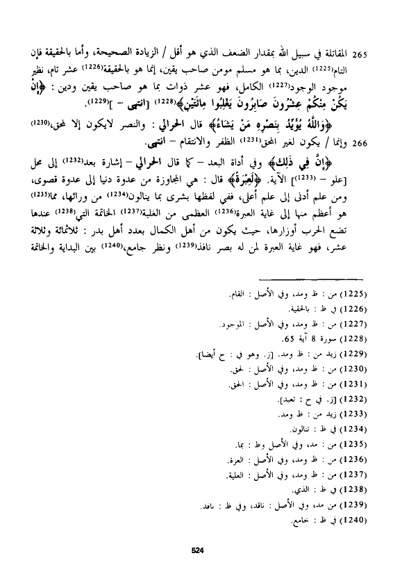 المقاتلة في سبيل الله بمقدار الضعف الذي هو أقل الزيادة الصحيحة، وأما بالحقيقة فإن التام الدين، بما هو مسلم مؤمن صاحب يقين، إنما هو بالحقيقة عشر تام، نظير موجود الوجود الكامل، فهو عشر ذوات بما هو صاحب يقين ودين: {إِنْ يَكُنْ مِنْكُمْ عِشْرُونَ صَابِرُونَ يَغْلِبُوا مِائَتَيْنِ} [انتهى -].