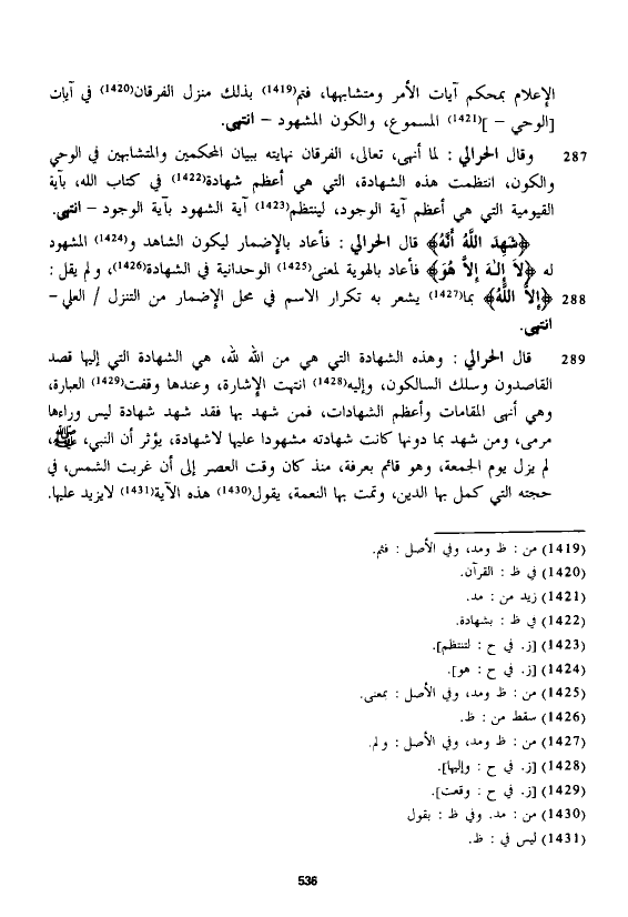 قال الْحَرَالِّي: وهذه الشهادة التي هي من الله الله، هي الشهادة التي إليها قصد القاصدون وسلك السالكون، وإليه انتهت الإشارة، وعندها وقفت العبارة، وهي أنهى المقامات وأعظم الشهادات، فمن شهد بها فقد شهد شهادة ليس وراءها مرمى، ومن شهد بما دونها كانت شهادته مشهودا عليها لا شهادة، يؤثر أن النبي، - صلى الله عليه وسلم -، لم يزل يوم الجمعة، وهو قائم بعرفة، منذ كان وقت العصر إلى أن غربت الشمس، في حجته التي كمل بها الدين، وتمت بها النعمة، يقول هذه الآية لا يزيد عليها.