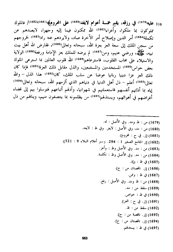 عليه في رزقه، يقيم خمسة أعوام لا يفد على المحروم} فالملوك مملوكون بما ملكوا، وأعزاء الله ممكنون فيما إليه وجهوا، لا يصدهم عن تكملة أمر الدين وإصلاح أمر الآخرة صاد، ولا يردهم عنه راد لخروجهم من سجن الملك إلى سعة العز بعزة الله، سبحانه وتعالى، فقارض الله أهل بيت نبيه، - صلى الله عليه وسلم -، ورضي عنهم، ومن لم يرضه للملك بعز الإمامة ورفعة الولاية والاستيلاء على محاب القلوب، فاسترعاهم الله قلوب العالمين بما استرعى الملوك بعض حواس المستخدمين والمستتبعين، والذل مقابل ذلك العزة فإذا كان ذلك العز عزاً دينيا ربانيا عوضا عن سلب الملك، كان هذا الذل - والله تعالى أعلم - ذل أهل الدنيا في دنياهم الذي ألزمهم الله، سبحانه وتعالى إياه بما أذلتهم أنفسهم فاستعملتهم في شهواتها، وأذلهم أتباعهم فتوسلوا بهم إلى قضاء أعراضهم في أهوائهم، ويستذلهم من يظلمونه بما ينتصفون منهم، وينالهم من ذل
