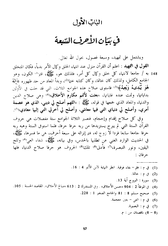 وفي كل صلاح إقدام وإحجام، فتصير الثلاثة الجوامع ستة مفصلات هي حروف القرآن الستة التي لم يبرح يستزيدها من ربه حرفا حرفا، فلما استوفى الستة وهبه ربه حرفا جامعا سابعا فرداً لا زوج له، فتم إنزاله على سبعة أحرف، هي ما فسرها، - صلى الله عليه وسلم -، في الحديث الوارد الغني عن تطلبها بالحدس، وفي بيانه، - صلى الله عليه وسلم -، شفاء العي وثلج اليقين، ونور التبصرة، فأدنى تلك الحروف هو حرفا صلاح الدنيا، فلها حرفان:
