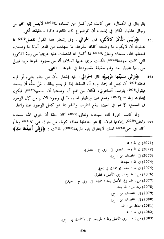 قال الْحَرَالِّي: وفي إشعار هذا القول تفصل مما تتخوفه أن لا يكون ما وضعته كفافا لنذرها، لما شهدت من ظاهر أنوثة ما وضعت، فجعلها الله، سبحانه وتعالى، لها أكمل مما اشتملت عليه عزيمتها من رتبة الذكورة التي كانت تعهدها، فكانت مريم، عليها السلام، أتم من معهود نذرها مزيد فضل من ربها عليها، بعد وفاء حقيقة مقصودها في نذرها - انتهى.