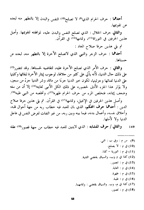 وأصل هذين الحرفين في الإنجيل، وتمامها في القرآن. ثم يلي هذين حرفا صلاح الدين: أحدهما حرف المحكم، الذي بان للعبد فيه خطاب ربه من جهة أحوال قلبه، وأخلاق نفسه، وأعمال بدنه، فيما بينه وبين ربه، من غير التفات لغرض النفس في عاجل الدنيا ولا لأملها.