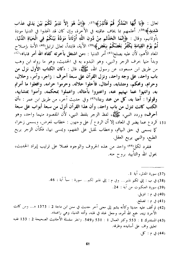 تعالى: {يَا أَيُّهَا الْمُدَّثِّرُ (1) قُمْ فَأَنْذِرْ}. {إِنْ هُوَ إِلَّا نَذِيرٌ لَكُمْ بَيْنَ يَدَيْ عَذَابٍ شَدِيدٍ}. أعلمهم بما يخاف عاقبته في الآخرة، وإن كان قد اتخذوا في الدنيا مودة بأوثانهم، وقال: (إِنَّمَا اتَّخَذْتُمْ مِنْ دُونِ اللَّهِ أَوْثَانًا مَوَدَّةَ بَيْنِكُمْ فِي الْحَيَاةِ الدُّنْيَا ثُمَّ يَوْمَ الْقِيَامَةِ يَكْفُرُ بَعْضُكُمْ بِبَعْضٍ} الآية، فابتدأ، تعالى ترتيل الأمة بإصلاح المعاد الأهم، لأن عليه يصلح أمر الدنيا: "من اشتغل بآخرته كفاه الله أمر دنياه" وبدأ منها بحرف الزجر والنهي، وهو المبدوء به في الحديث، وهو ما رواه ابن وهب من طريق ابن مسعود، عن رسول الله، - صلى الله عليه وسلم -، قال: "كان الكتاب الأول نزل من باب واحد، على وجه واحد، ونزل القرآن على سبعة أحرف: زاجر، وآمر، وحلال، وحرام، ومحكم، ومتشابه، وأمثال، فأحلوا حلاله، وحرموا حرامه، وافعلوا ما أمرتم به، وانتهوا عما نهيتهم عنه، واعتبروا بأمثاله، واعملوا بمحكمه، وآمنوا بمتشابهه، وقولوا: آمنا به، كل من عند ربنا" وفي حديث آخر، من طريق ابن عمر: "أن الكتب كانت تنزل من باب واحد، وأن هذا القرآن أنزل من سبعة أبواب على سبعة أحرف" وردد النبي، - صلى الله عليه وسلم -، لفظ الزجر بلفظ النهي، لأن المقصود منهما واحد، وهو الردع عما يضر في المعاد، إلا أن الردع على وجهين: خطاب لمعرض، ويسمى زجرا، كما يسمى في حق البهائم، وخطاب لمقبل على التفهم، ويمسي نهيا، فكأن الزجر يريع الطبع، والنهي يريع العقل.