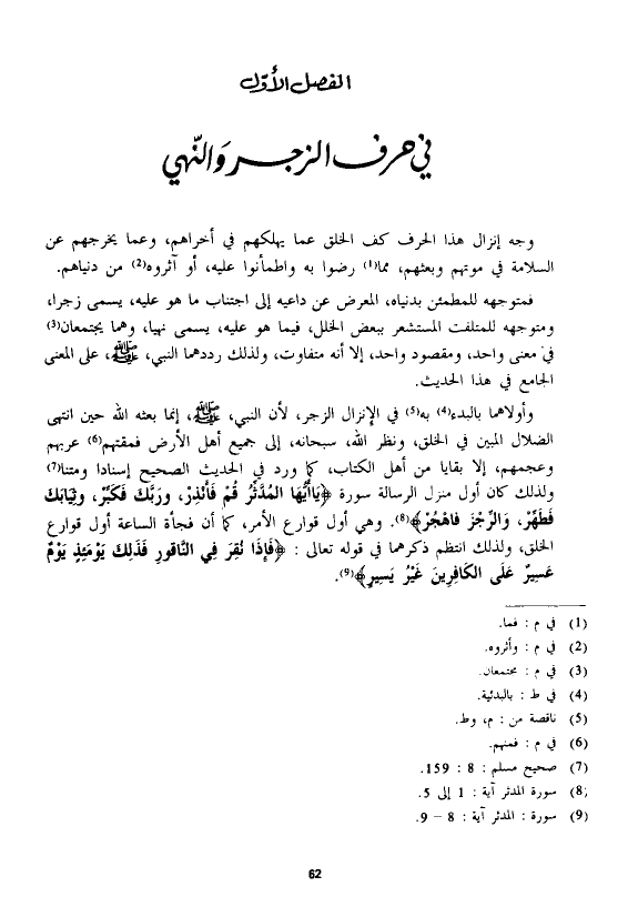 وأولاهما بالبدء به في الإنزال الزجل، لأن النبي، - صلى الله عليه وسلم -، إنما بعثه الله حين انتهى الضلال المبين في الخلق، ونظر الله، سبحانه، إلى جميع أهل الأرض فمقتهم عربهم وعجمهم، إلا بقايا من أهل الكتاب، كما ورد في الحديث الصحيح إسنادا ومتنا ولذلك كان أول منزل الرسالة سورة {يا يَا أَيُّهَا الْمُدَّثِّرُ (1) قُمْ فَأَنْذِرْ (2) وَرَبَّكَ فَكَبِّرْ (3) وَثِيَابَكَ فَطَهِّرْ (4) وَالرُّجْزَ فَاهْجُرْ}. وهي أول قوارع الأمر، كما أن فجأة الساعة أول قوارع الخلق، ولذلك انتظم ذكرهما في قوله تعالى: {فَإِذَا نُقِرَ فِي النَّاقُورِ (8) فَذَلِكَ يَوْمَئِذٍ يَوْمٌ عَسِيرٌ (9) عَلَى الْكَافِرِينَ غَيْرُ يَسِيرٍ}.