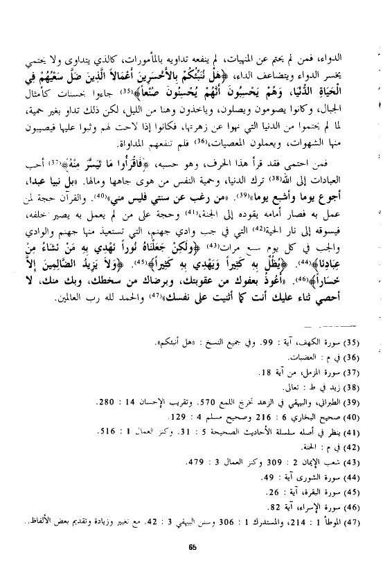 الدواء، فمن لم يحتم عن المنهيات، لم ينفعه تداويه بالمأمورات، كالذي يتداوى ولا يحتمي يخسر الدواء ويتضاعف الداء، {هَلْ نُنَبِّئُكُمْ بِالْأَخْسَرِينَ أَعْمَالًا (103) الَّذِينَ ضَلَّ سَعْيُهُمْ فِي الْحَيَاةِ الدُّنْيَا وَهُمْ يَحْسَبُونَ أَنَّهُمْ يُحْسِنُونَ صُنْعًا} جاءوا بحسنات كأمثال الجبال، وكانوا يصومون ويصلون، وياخذون وهنا من الليل، لكن ذلك تداو بغير حمية، لما لم يحتموا من الدنيا التي نهوا عن زهرتها، فكانوا إذا لاحت لهم وثبوا عليها فيصيبون منا الشهوات، ويعملون المعصيات، فلم تنفعهم المداواة.
