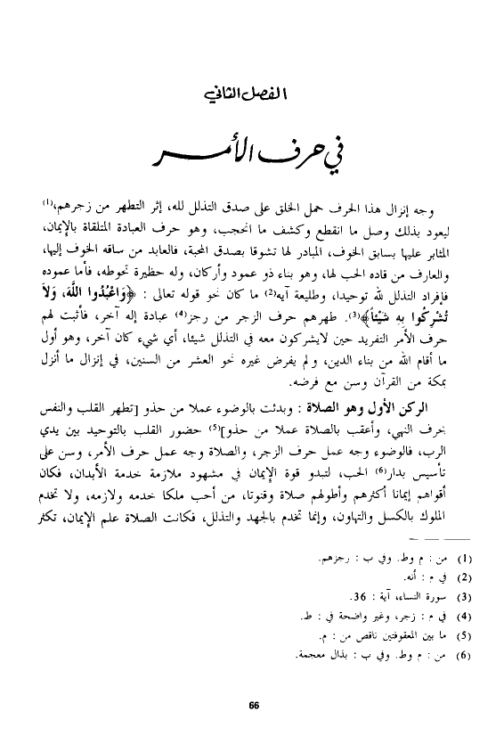 وجه إنزال هذا الحرف حمل الخلق على صدق التذلل لله، إثر التطهر من زجرهم، ليعود بذلك وصل ما انقطع وكشف ما انحجب، وهو حرف العبادة المتلقاة بالإيمان، المثابر عليها بسابق الخوف، المبادر لها تشوقا بصدق المحبة، فالعابد ما ساقه الخوف إليها، والمعارف من قاده الحب لها، وهو بناء ذو عمود وأركان، وله حظيرة تحوطه، فأما عموده فإفراد التذلل لله توحيداً، وطليعة آيه ما كان نحو قوله تعالى: {وَاعْبُدُوا اللَّهَ وَلَا تُشْرِكُوا بِهِ شَيْئًا}. طهرهم حرف الزجر من رجز عبادة إله آخر، فأثبت لهم حرف الأمر التفريد حين لايشركون معه في التذلل شيئا، أي شيء كان آخر، وهو أول ما أقام الله من بناء الدين، ولم يفرض غيره نحو العشر من السنين، في إنزال ما أنزل بمكة من القرآن وسن مع فرضه.