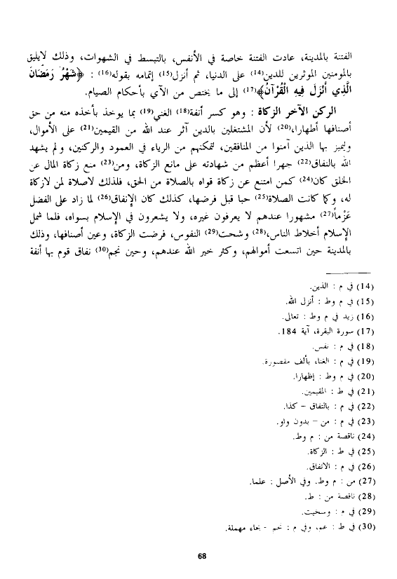 الركن الآخر الزكاة: وهو كسر أنفة الغني بما يؤخذ بأخذه منه من حق أصنافها أطهارا، لأن المشتغلين بالدين آثر عند الله من القيمين على الأموال، وليميز بها الذين آمنوا من المنافقين، لتمكنهم من الرياء في العمود والركنين، ولم يشهد الله بالنفاق جهراً أعظم من شهادته على مانع الزكاة، ومن منع زكاة المال عن الخلق كان كمن أمتنع عن زكاة قواه بالصلاة من الحق، فلذلك لا صلاة لمن لا زكاة له، وكما كانت الصلاة حبا قبل فرضها، كذلك كان الإنفاق لما زاد على الفضل عزما مشهوراً عندهم لا يعرفون غيره، ولا يشعرون في الإسلام بسواه، فلما شمل الإسلام أخلاط الناس، وشحت النفوس، فرضت الزكاة، وعين أصنافها، وذلك بالمدينة حين اتسعت أموالهم، وكثر خير الله عندهم، وحين نجم نفاق قوم بها أنفة