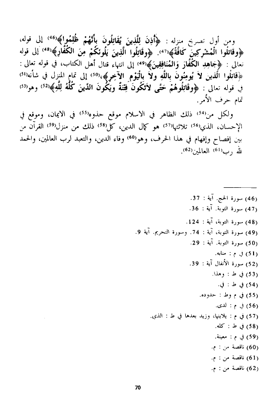 ومن أول تصريح منزله: {أُذِنَ لِلَّذِينَ يُقَاتَلُونَ بِأَنَّهُمْ ظُلِمُوا} إلى قوله، {وَقَاتِلُوا الْمُشْرِكِينَ كَافَّةً}. {قَاتِلُوا الَّذِينَ يَلُونَكُمْ مِنَ الْكُفَّارِ} إلى قوله تعالي: {جَاهِدِ الْكُفَّارَ وَالْمُنَافِقِينَ} إلى انتهاء قتال أهل الكتاب، في قوله نعالى: {قَاتِلُوا الَّذِينَ لَا يُؤْمِنُونَ بِاللَّهِ وَلَا بِالْيَوْمِ الْآخِرِ} إلى تمام المنزل في شأنه في قوله تعالى: {وَقَاتِلُوهُمْ حَتَّى لَا تَكُونَ فِتْنَةٌ وَيَكُونَ الدِّينُ كُلُّهُ لِلَّهِ} وهو تمام حرف الأمر.